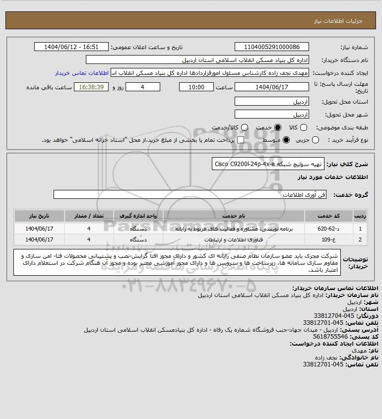 شرح کلی نیاز: تهیه سوئیچ شبکه Cisco C9200l-24p-4x-e