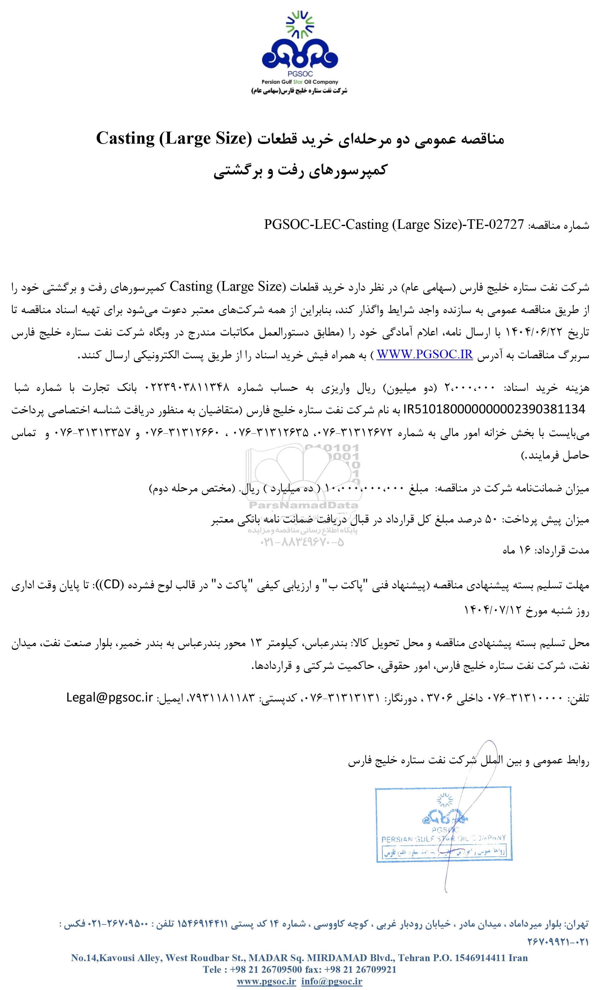 شماره مناقصه: PGSOC-LEC-Casting (Large Size)-TE- 02727