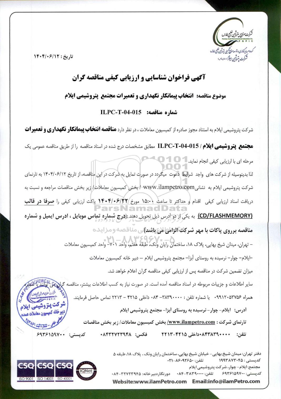 شرکت پتروشیمی ایلام به استناد مجوز صادره از کمیسیون معاملات ، در نظر دارد مناقصه انتخاب پیمانكار نگهداری و تعمیرات مجتمع پتروشیمی ایلام / ILPC-T-04-015 مطابق مشخصات درج شده در اسناد مناقصه را از طریق مناقصه عمومی یک مرحله ای با ارزیابی کیفی انجام نماید.
