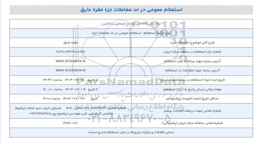 تاریخ ثبت (نیاز) استعلام در سامانه ستاد ایران: از تاریخ 1404.06.11 ساعت 14:47