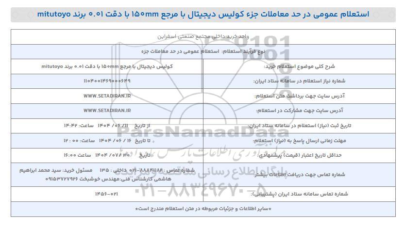 شرح کلی موضوع استعلام خرید: کولیس دیجیتال با مرجع 150mm با دقت 0.01 برند mitutoyo