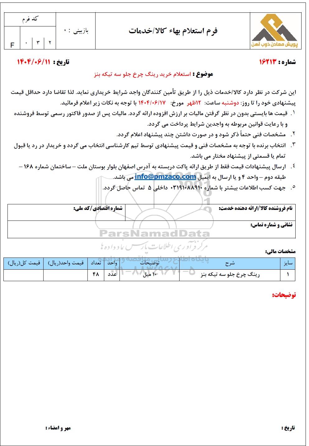 این شرکت در نظر دارد کالا / خدمات ذیل را از طریق تأمین کنندگان واجد شرایط خریداری نماید. لذا تقاضا دارد حداقل قیمت پیشنهادی خود را تا روز: دوشنبه ساعت 12 ظهر مورخ 1404.06.17 با توجه به نکات زیر اعلام فرمائید.