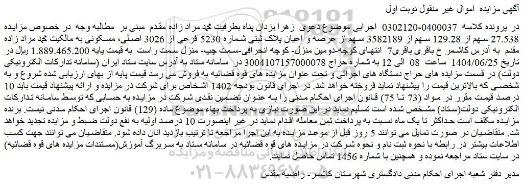 در پرونده کلاسه 0302120-0400037 اجرایی موضوع دعوی زهرا یزدان پناه بطرفیت محمد مراد زاده مقدم مبنی بر مطالبه وجه در خصوص مزایده 27.538 سهم از 129.28 سهم از 3582189 سهم از عرصه و اعیان پلاک ثبتی شماره 5230 فرعی از 3026 اصلی، مسکونی به مالکیت محمد مراد زاده مقدم به آدرس کاشمر خ باقری باقری7 انتهای کوچه-دومین منزل- کوچه انحرافی-سمت چپ- منزل سمت راست به قیمت پایه 1.889.465.200 ریال در تاریخ 1404/06/25 ساعت 08 الی 12 به شماره حراج 3004107157000078 در سامانه ستاد به آدرس سایت ستاد ایران (سامانه تدارکات الکترونیکی دولت) در قسمت مزایده های حراج دستگاه های اجرائی و تحت عنوان مزایده های قوه قضائیه به فروش می رسد قیمت پایه از بهای ارزیابی شده شروع و به شخصی که بالاترین قیمت را پیشنهاد نماید فروخته خواهد شد. در اجرای قانون بودجه 1402 اشخاص برای شرکت در مزایده و ارائه پیشنهاد قیمت باید 10 درصد قیمت مقرر در مواد (73 تا 75) قانون اجرای احکام مدنی را به عنوان تضمین نقدی شرکت در مزایده به حسابی که توسط سامانه تدارکات الکترونیکی دولت(ستاد) مشخص شده است تسلیم نماید در این صورت نیازی به پرداخت بهاء موضوع ماده (129) قانون اجرای احکام مدنی نیست. برنده مزایده مکلف است حداکثر تا یک ماه نسبت به پرداخت ثمن معامله اقدام نماید در غیر اینصورت 10 درصد اولیه به نفع دولت ضبط و مزایده تجدید خواهد شد. متقاضیان در صورت تمایل می توانند 5 روز قبل از موعد مزایده به این اجرا مراجعه تا ترتیب بازدید آنان داده شود. متقاضیان می توانند جهت کسب اطلاعات بیشتر در رابطه با نحوه ثبت نام و نحوه شرکت در مزایده های قوه قضائیه در سامانه ستاد به سربرگ آموزش(مستندات مزایده های قوه قضائیه) در سایت ستاد مراجعه نموده و همچنین با شماره 1456 تماس حاصل نمایند.