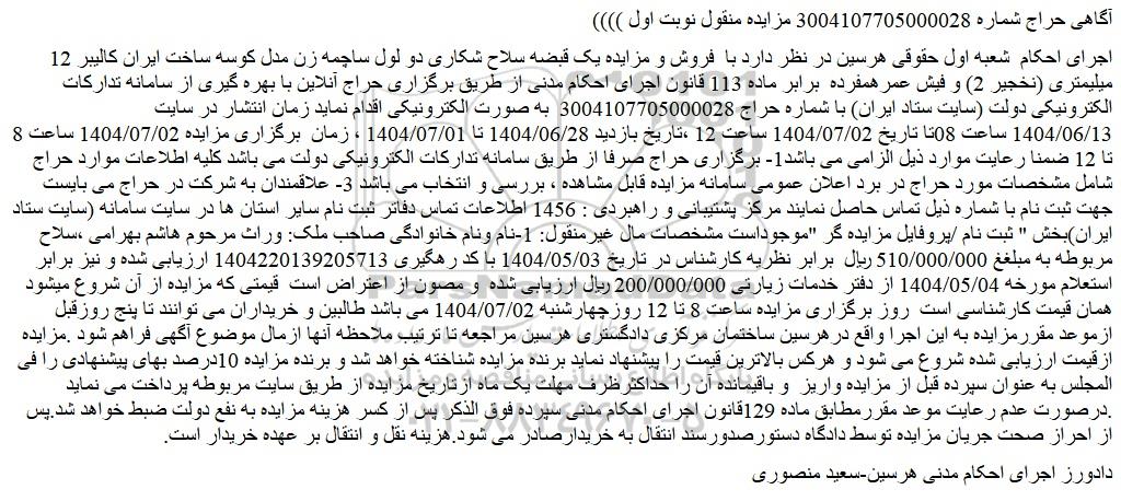 اجرای احکام شعبه اول حقوقی هرسین در نظر دارد با فروش و مزایده یک قبضه سلاح شکاری دو لول ساچمه زن مدل کوسه ساخت ایران کالیبر 12 میلیمتری (نخجیر 2) و فیش عمرهمفرده برابر ماده 113 قانون اجرای احکام مدنی از طریق برگزاری حراج آنلاین با بهره گیری از سامانه تدارکات الکترونیکی دولت (سایت ستاد ایران) با شماره حراج 3004107705000028 به صورت الکترونیکی اقدام نماید زمان انتشار در سایت 1404/06/13 ساعت 08تا تاریخ 1404/07/02 ساعت 12 ،تاریخ بازدید 1404/06/28 تا 1404/07/01 ، زمان برگزاری مزایده 1404/07/02 ساعت 8 تا 12 ضمنا رعایت موارد ذیل الزامی می باشد1- برگزاری حراج صرفا از طریق سامانه تدارکات الکترونیکی دولت می باشد کلیه اطلاعات موارد حراج شامل مشخصات مورد حراج در برد اعلان عمومی سامانه مزایده قابل مشاهده ، بررسی و انتخاب می باشد 3- علاقمندان به شرکت در حراج می بایست جهت ثبت نام با شماره ذیل تماس حاصل نمایند مرکز پشتیبانی و راهبردی : 1456 اطلاعات تماس دفاتر ثبت نام سایر استان ها در سایت سامانه (سایت ستاد ایران)بخش " ثبت نام /پروفایل مزایده گر "موجوداست مشخصات مال غیرمنقول: 1-نام ونام خانوادگی صاحب ملک: وراث مرحوم هاشم بهرامی ،سلاح مربوطه به مبلغغ 510/000/000 ریال برابر نظریه کارشناس در تاریخ 1404/05/03 با کد رهگیری 1404220139205713 ارزیابی شده و نیز برابر استعلام مورخه 1404/05/04 از دفتر خدمات زیارتی 200/000/000 ریال ارزیابی شده و مصون از اعتراض است قیمتی که مزایده از آن شروع میشود همان قیمت کارشناسی است روز برگزاری مزایده ساعت 8 تا 12 روزچهارشنبه 1404/07/02 می باشد طالبین و خریداران می توانند تا پنج روزقبل ازموعد مقررمزایده به این اجرا واقع درهرسین ساختمان مرکزی دادگستری هرسین مراجعه تا ترتیب ملاحظه آنها ازمال موضوع آگهی فراهم شود .مزایده ازقیمت ارزیابی شده شروع می شود و هرکس بالاترین قیمت را پیشنهاد نماید برنده مزایده شناخته خواهد شد و برنده مزایده 10درصد بهای پیشنهادی را فی المجلس به عنوان سپرده قبل از مزایده واریز و باقیمانده آن را حداکثرظرف مهلت یک ماه ازتاریخ مزایده از طریق سایت مربوطه پرداخت می نماید .درصورت عدم رعایت موعد مقررمطابق ماده 129قانون اجرای احکام مدنی سپرده فوق الذکر پس از کسر هزینه مزایده به نفع دولت ضبط خواهد شد.پس از احراز صحت جریان مزایده توسط دادگاه دستورصدورسند انتقال به خریدارصادر می شود.هزینه نقل و انتقال بر عهده خریدار است.