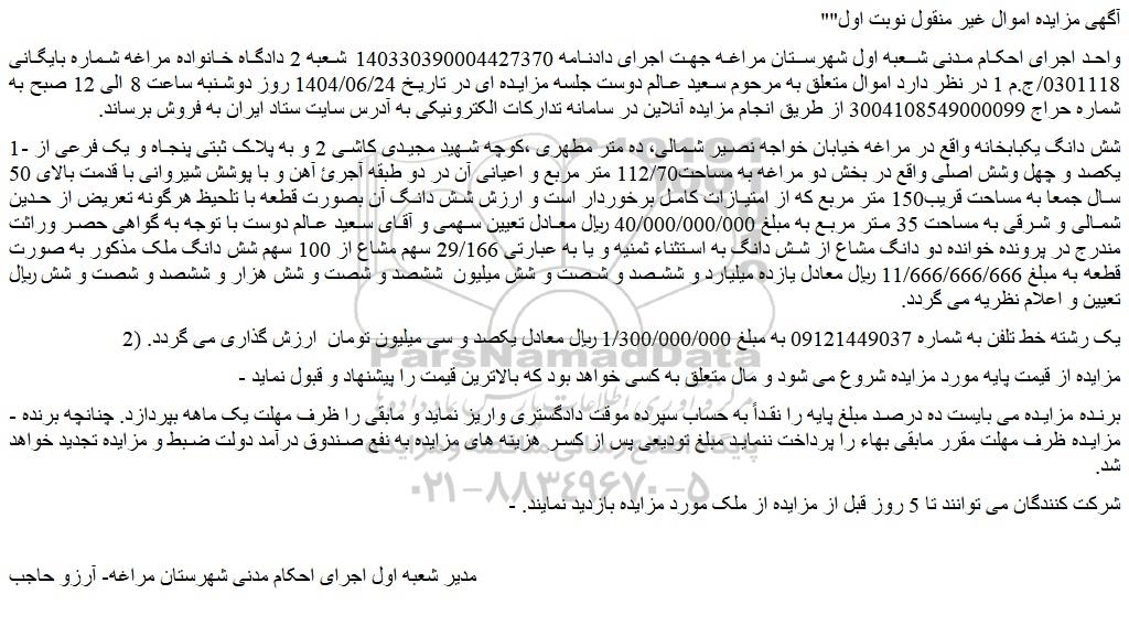 واحد اجرای احکام مدنی شعبه اول شهرستان مراغه جهت اجرای دادنامه 140330390004427370 شعبه 2 دادگاه خانواده مراغه شماره بایگانی 0301118/ج.م 1 در نظر دارد اموال متعلق به مرحوم سعید عالم دوست جلسه مزایده ای در تاریخ 1404/06/24 روز دوشنبه ساعت 8 الی 12 صبح به شماره حراج 3004108549000099 از طریق انجام مزایده آنلاین در سامانه تدارکات الکترونیکی به آدرس سایت ستاد ایران به فروش برساند.