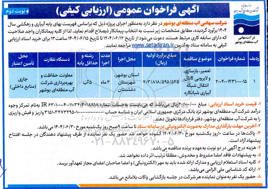 شرکت سهامی آب منطقه ای بوشهر در نظر دارد به منظور اجرای پروژه ذیل که بر اساس فهرست بهای پایه آبیاری و زهکشی سال 1404 برآورد گردیده مطابق مشخصات زیر نسبت به انتخاب پیمانکار ذیصلاح اقدام نماید لذا از کلیه پیمانکاران واجد صلاحیت که دارای سابقه کاری مرتبط هستند دعوت میشود از تاریخ 1404.06.12 تا تاریخ 1404.06.15 ساعت 13 برای خرید اسناد ارزیابی کیفی به سامانه ستاد به آدرس ستاد ایران مراجعه نمایند.