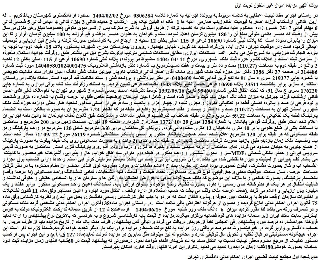 در راستای اجرای مفاد نیابت اعطایی به کلاسه مربوط به پرونده اجرائیه به شماره کلاسه 0306284 مورخ 1404/02/02 صادره از دادگستری شهرستان رباط کریم ، له آرین فدائی ارشتناب فرزند اصغر با قیومیت خانم زینب صارمی علیه ها 1 خانم ام البنین نیک پور ارتشاب 2 حمیده فدائی 3 بهزاد فدائی 4 عباس فدائی 5 شمسی فدائی 6 بهنام فدائی 7 الناز خسرو زاده محکوم علیه محکوم است به: به تقسیم ترکه از طریق فروش به شرح ماترک پس از کسر دیون متوفی (خصوصا مبلغ رهن منزل در سال پیش از وفات که همسر دائمی متوفی مبلغ آن را 180 میلیون تومان اعلام نموده است و خواهان به عنوان همسر موقت و قیم فرزند به 100 میلیون تومان اقرار و تا این میزان را پذیرش نموده است لذا پلاک ثبتى شماره 10690 فرعى از 115 اصلى بخش 12 ناحیه 2 ارجاع امر به کارشناس صورت گرفته و بشرح ذیل ارزیابی و توصیف اجمالی گردیده است: در موقعیت تهران، نازی آباد، بزرگراه شهید تند گویان، خیابان بهمنیار، روبروی بیمارستان مفرح، شهرک پاستور، پلاک 18، طبقه دوم؛ با توجه به بازدید انجام شدهارزیابی، به شرح ذیل می باشد. الف- مستندات ابرازی: مطابق مستندات تسلیمی بترتیب اولویت بشرح ذیل می باشند. طبق روگرفت جوابیه استعلام مأخوذه از سازمان ثبت اسناد و املاک کشور حوزه ثبت ملک شهرری، مورخ 11 /04 /1404 مضبوط در پرونده؛ پلاک ثبتى شماره 10690 فرعى از 115 اصلى بخش 12 ناحیه 2 واقع در طبقه دوم به مساحت (110.27) صد و ده متر و بیست و هفت دسیمترمربع با شماره دفتر بازداشتى الکترونیک 140405801024001475 مورد ثبت شماره 314486 در صفحه 37 دفتر 1386 دفاتر غار حوزه ثبت ملک شهر رى مالک آقاى اصغر فدائى ارشتناب نام پدر جبرئیل مالک شش دانگ اعیان داراى سند مالکیت تعویضى با شماره چاپى 219377 سرى ه سال 91 به نفع آرین فدایى کلاسه 0400409، در دفتر بازداشتی و پرونده ثبتی و سند مالکیت قید گردیده است. سابقه پلاک: در راستاى استاندارد سازى برابر بخشنامه 23511 پلاک 10690 فرعی حاصل تغییر پلاک 4503 باقیمانده فرعی تعیین گردید. به استناد روگرفت سند تک برگی ابرازی به شماره چاپى 176220 سرى ج سال 91، که تحت انتقال قطعى شماره 99460 تاریخ 1392/05/16 توسط دفترخانه اسناد رسمى شماره 3 شهر ری تهران به نام مالک فعلی آقای اصغر فدائى ارشتناب فرزند جبرئیل به میزان ششدانگ اعیان سند ثبت و صادر شده است و شامل اعیان آپارتمان (وضعیت خاص طلق با عرصه وقف) به شماره ده هزار و ششصد و نود فرعى از صد و پانزده اصلى قطعه دو تفکیکى مفروز و مجزى شده از چهار هزار و پانصد و سه فرعى از اصلى مذکور ناحیه غار بخش دوازده حوزه ثبت ملک شهررى استان تهران به مساحت (110.27) صد و ده متر و بیست و هفت دسیمترمربع واقع در طبقه دو که مقدار 7.24 مترمربع آن به صورت بالکن است به انضمام پارکینگ قطعه یک تفکیکی به مساحت 59.22 مترمربع واقع در طبقه همکف با قدرالسهم از سایر مشاعات و مشترکات طبق قانون تملک آپارتمان ها وآئین نامه اجرایى آن اعلام شده است. طبق روگرفت گواهی پایانکار به شماره 1384 مورخ 29 /10 /1372 صادره از شهرداری منطقه 19 تهران، مساحت زمین برابر 200 مترمربع و ساختمان با اسکلت بتنی از ضلع جنوبی با بر 10 متری به خیابان 12 متری محدود می گردد. زیربنای کل ساختمان برابر 360 مترمربع شامل 120 مترمربع دو واحد پارکینگ و دو طبقه مسکونی که هر طبقه برابر 120 مترمربع اعلام شده است. همچنین پایانکار مذکور بر اساس پایانکار ساختمانی شماره 26119 مورخ 22 /09 /71 صادر شده است. ب- وضعیت ملک زمان بازدید: طبق بازدید صورت گرفته، ساختمان قدیمی در 2 طبقه تک واحدی (2 واحد ) به صورت مسکونی روی یک طبقه پیلوت به صورت پارکینگ از ضلع جنوبی به خیابان محدود می گردد. نمای ساختمان از نرمه سیمان سفید و پنجره ها فلزی و درب ورودی آدم رو و پارکینگ فلزی است. ساختمان به صورت قدیمی ساز و بدون آسانسور و واحد مذکور در طبقه دوم دارای سه اطاق خواب، هال و پذیرایی، آشپزخانه غیرمحصور با کابینت mdf، سرویس ایرانی و حمام، بالکن شمالی می باشد. کف پذیرایی از لمینیت و دیوارها نقاشی شده می باشد. دارای سرویس ایرانی و حمام می باشد. سیستم سرمایش 