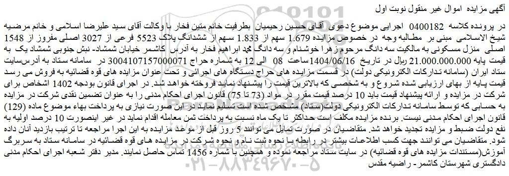 در پرونده کلاسه 0400182 اجرایی موضوع دعوی آقای حسین رحیمیان بطرفیت خانم متین فخار با وکالت آقای سید علیرضا اسلامی و خانم مرضیه شیخ الاسلامی مبنی بر مطالبه وجه در خصوص مزایده 1.679 سهم از 1.833 سهم از ششدانگ پلاک 5523 فرعی از 3027 اصلی مفروز از 1548 اصلی منزل مسکونی به مالکیت سه دانگ مرحوم زهرا خوشنام و سه دانگ محمد ابراهیم فخار به آدرس کاشمر خیابان شمشاد- نبش جنوبی شمشاد یک به قیمت پایه 21.000.000.000 ریال در تاریخ 1404/06/16ساعت 08 الی 12 به شماره حراج 3004107157000071 در سامانه ستاد به آدرسسایت ستاد ایران (سامانه تدارکات الکترونیکی دولت) در قسمت مزایده های حراج دستگاه های اجرائی و تحت عنوان مزایده های قوه قضائیه به فروش می رسد قیمت پایه از بهای ارزیابی شده شروع و به شخصی که بالاترین قیمت را پیشنهاد نماید فروخته خواهد شد. در اجرای قانون بودجه 1402 اشخاص برای شرکت در مزایده و ارائه پیشنهاد قیمت باید 10 درصد قیمت مقرر در مواد (73 تا 75) قانون اجرای احکام مدنی را به عنوان تضمین نقدی شرکت در مزایده به حسابی که توسط سامانه تدارکات الکترونیکی دولت(ستاد) مشخص شده است تسلیم نماید در این صورت نیازی به پرداخت بهاء موضوع ماده (129) قانون اجرای احکام مدنی نیست. برنده مزایده مکلف است حداکثر تا یک ماه نسبت به پرداخت ثمن معامله اقدام نماید در غیر اینصورت 10 درصد اولیه به نفع دولت ضبط و مزایده تجدید خواهد شد. متقاضیان در صورت تمایل می توانند 5 روز قبل از موعد مزایده به این اجرا مراجعه تا ترتیب بازدید آنان داده شود. متقاضیان می توانند جهت کسب اطلاعات بیشتر در رابطه با نحوه ثبت نام و نحوه شرکت در مزایده های قوه قضائیه در سامانه ستاد به سربرگ آموزش(مستندات مزایده های قوه قضائیه) در سایت ستاد مراجعه نموده و همچنین با شماره 1456 تماس حاصل نمایند. مدیر دفتر شعبه اجرای احکام مدنی دادگستری شهرستان کاشمر- راضیه مقدس