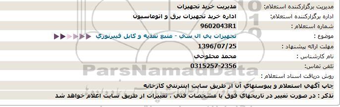 استعلام تجهیزات پی ال سی - منبع تغذیه و کابل فیبرنوری , استعلام تجهیزات پی ال سی - منبع تغذیه و کابل فیبرنوری
