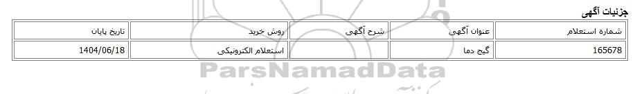 | 165678 | گیج دما | استعلام الکترونیکی | 1404/06/18 |