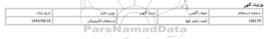 | 168179 | المنت فیلتر هوا | استعلام الکترونیکی | 1404/06/18 |