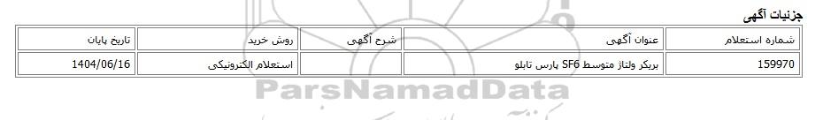 | 159970 | بریکر ولتاژ متوسط SF6 پارس تابلو | استعلام الکترونیکی | 1404/06/16 |