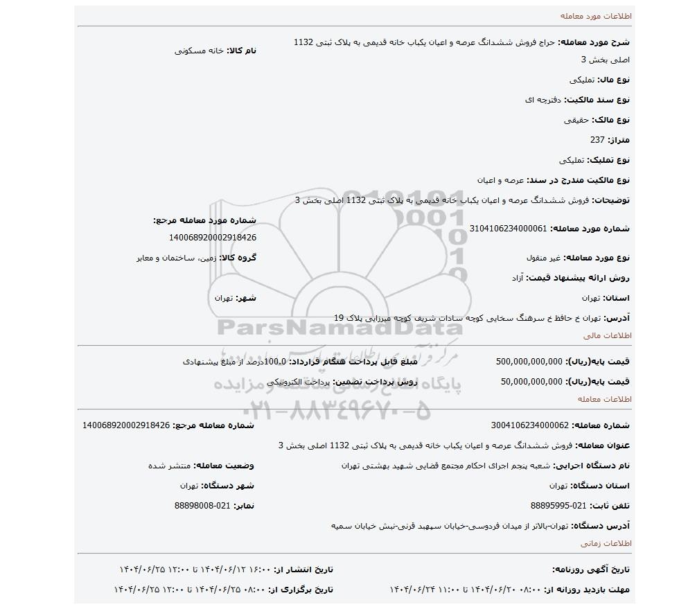 | قیمت پایه(ریال): 50,000,000,000 | روش پرداخت تضمین: پرداخت الکترونیکی |