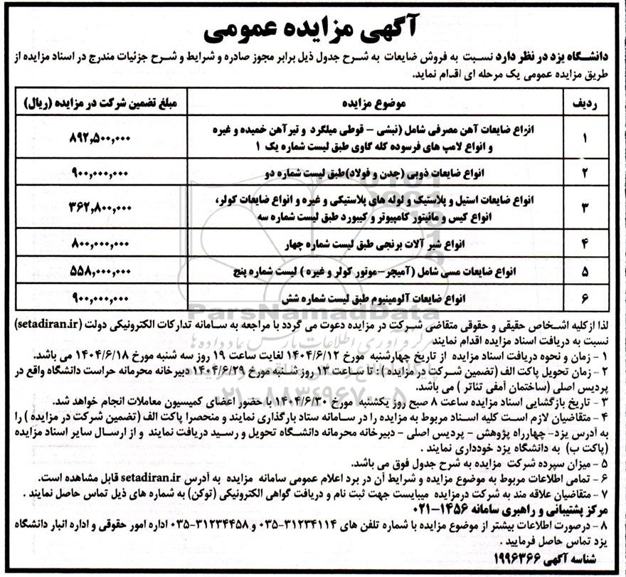 دانشگاه یزد در نظر دارد نسبت به فروش ضایعات به شرح جدول ذیل برابر مجوز صادره و شرایط و شرح جزئیات مندرج در اسناد مزایده از طریق مزایده عمومی یک مرحله ای اقدام نماید.