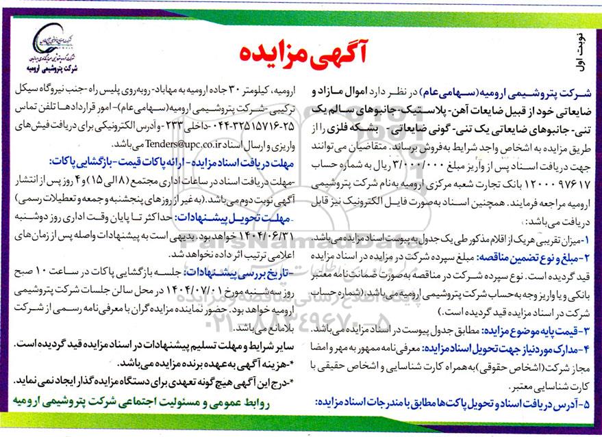 شرکت پتروشیمی ارومیه (سهامی عام) در نظر دارد اموال مازاد و ضایعاتی خود از قبیل ضایعات آهن- پلاستیک- جانبوهای سالم یک تنی - جانبوهای ضایعاتی یک تنی- گونی ضایعاتی- بشکه فلزی را از طريق مزایده به اشخاص واجد شرایط به فروش برساند. متقاضیان میتوانند جهت دریافت اسناد پس از واریز مبلغ 3.000.000 ریال به شماره حساب 1200097617 بانک تجارت شعبه مرکزی ارومیه به نام شرکت پتروشیمی ارومیه مراجعه فرمایند. همچنین اسناد به صورت فایل الکترونیک نیز قابل دریافت میباشد: