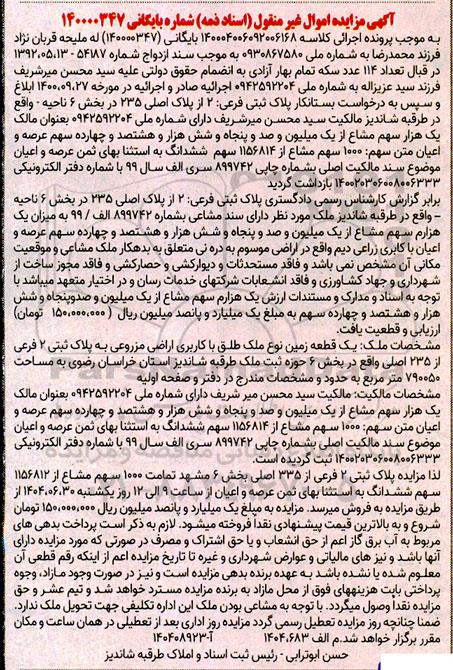 موضوع مزایده : پلاک ثبتی فرعی 2 از پلاک اصلی 235 در بخش 6 ناحیه - واقع در طرقبه شاندیز به ارزش یک میلیارد و پانصد میلیون ریال ( 150.000.000 تومان)