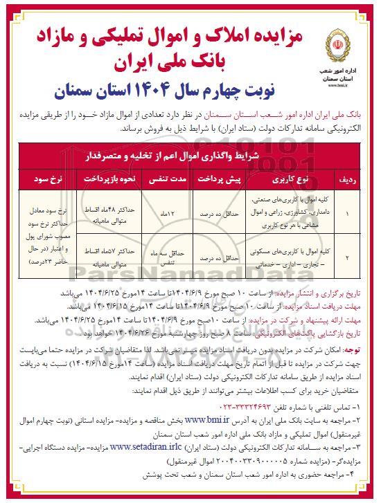 مزایده املاک و اموال تملیکی و مازاد بانک ملی ایران نوبت سوم سال 1404 استان سمنان ؟