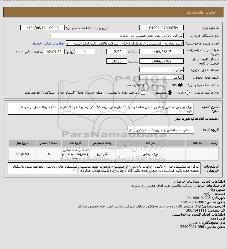 شرح کلی نیاز: ورق برنجی مطابق با شرح کامل تقاضا و الزامات بازرسی پیوست/ ذکر برند پیشنهادی الزامیست/ هزینه حمل بر عهده فروشنده