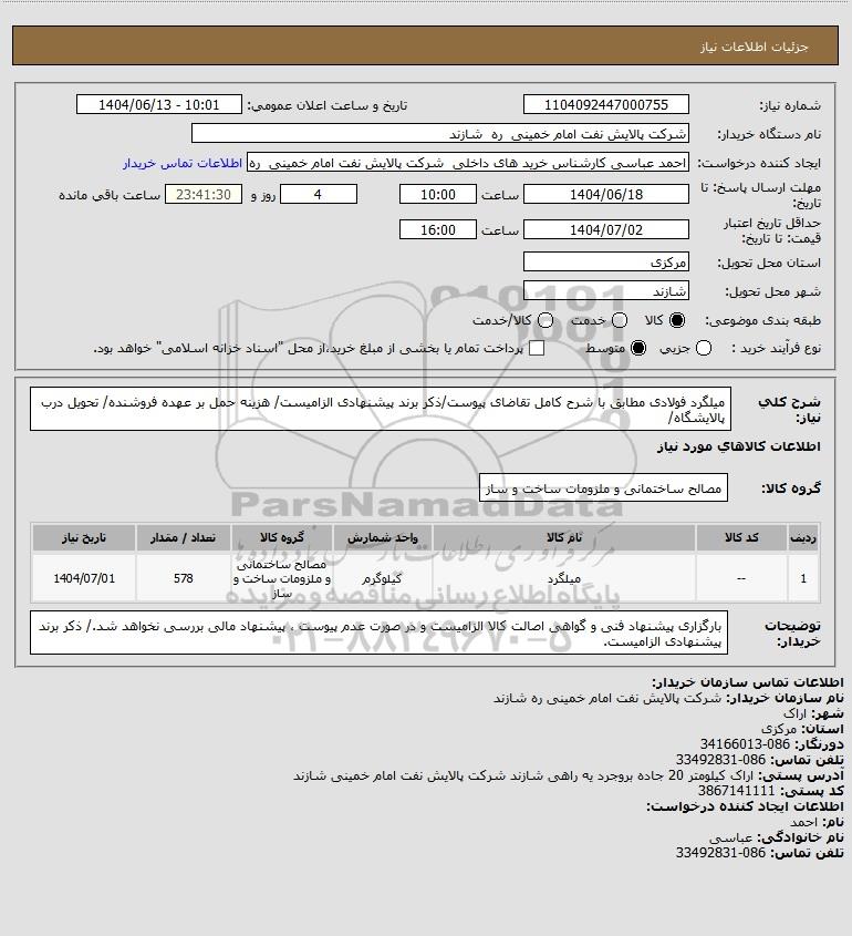 شرح کلی نیاز: میلگرد فولادی مطابق با شرح کامل تقاضای پیوست/ذکر برند پیشنهادی الزامیست/ هزینه حمل بر عهده فروشنده/ تحویل درب پالایشگاه/