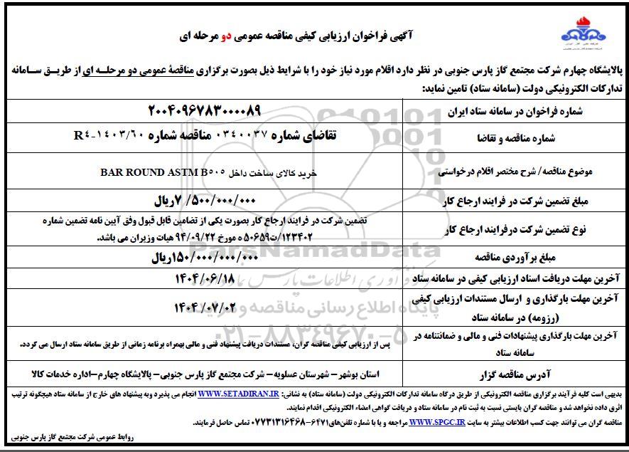 فراخوان ارزیابی کیفی مناقصه خرید کالای ساخت داخل BAR ROUND ASTM B505 از کلیه افراد متخصص و شرکتها واجد شرایط دعوت به عمل میآید در مناقصه با کد خبرگزاری پارس نماد: 9500134 شرکت نمایند.
