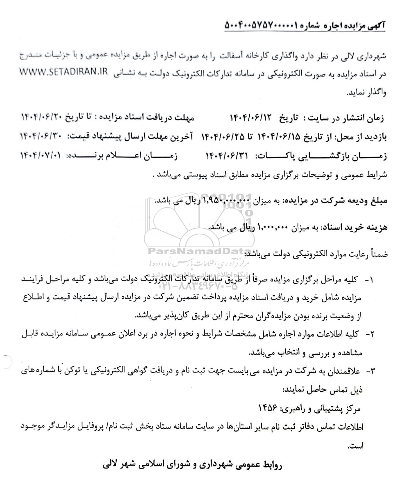 شهرداری لالی در نظر دارد واگذاری کارخانه آسفالت را به صورت اجاره از طریق مزایده عمومی و با جزئیات مندرج در اسناد مزایده به صورت الکترونیکی در سامانه تدارکات الکترونیک دولت ستاد ایران واگذار نماید.