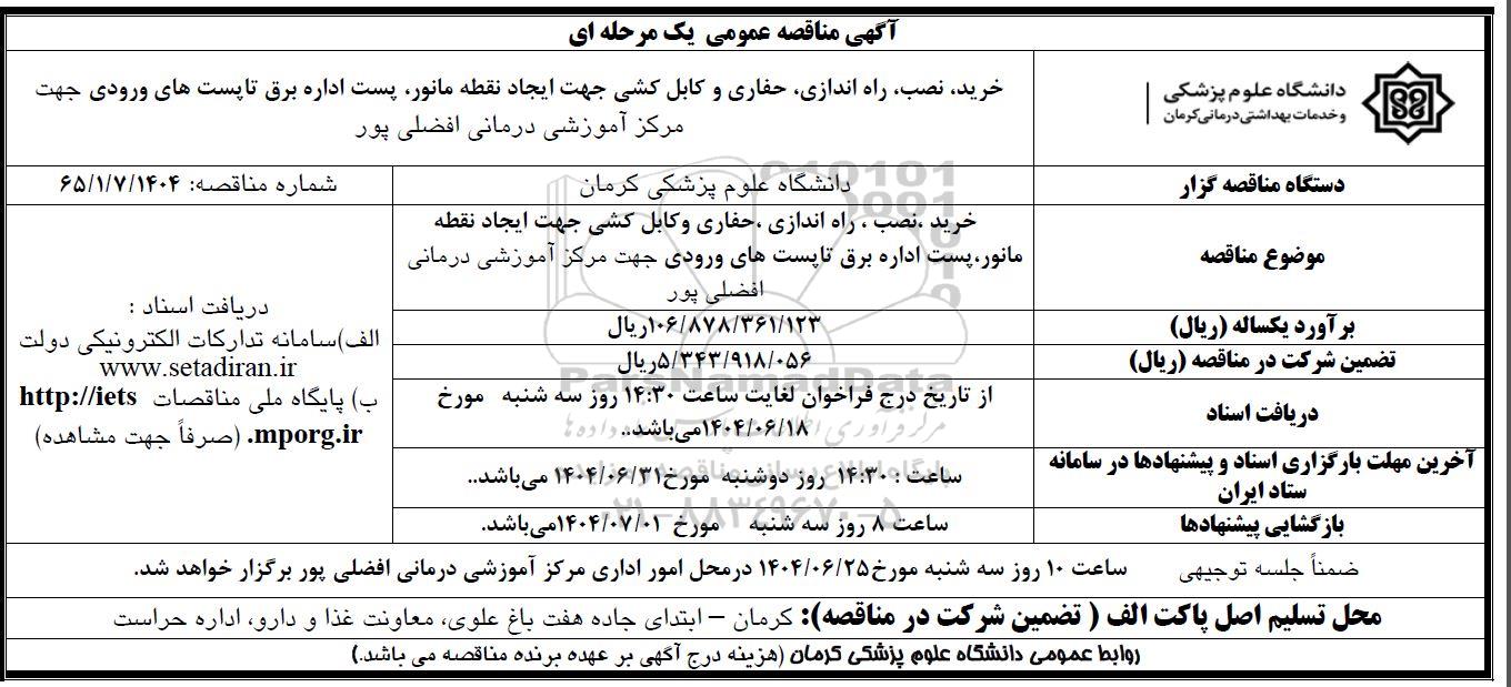 موضوع مناقصه: خرید ، نصب ، راه اندازی ، حفاری و کابل کشی جهت ایجاد نقطه مانور پست اداره برق تاپستهای ورودی جهت مرکز آموزشی درمانی افضلی پور