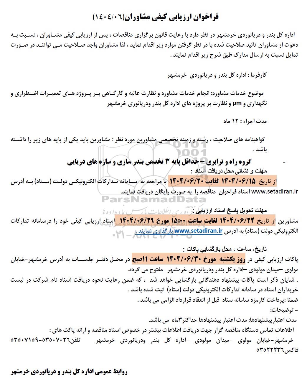اداره کل بندر و دریانوردی خرمشهر در نظر دارد با رعایت قانون برگزاری مناقصات، پس از ارزیابی کیفی مشاوران، نسبت به دعوت از مشاوران تائید صلاحیت شده با در نظر گرفتن موارد زیر اقدام نماید ، لذا مشاوران واجد صلاحیت می توانند در صورت تمایل نسبت به ارسال مدارک طبق شرح زیر اقدام نمایند