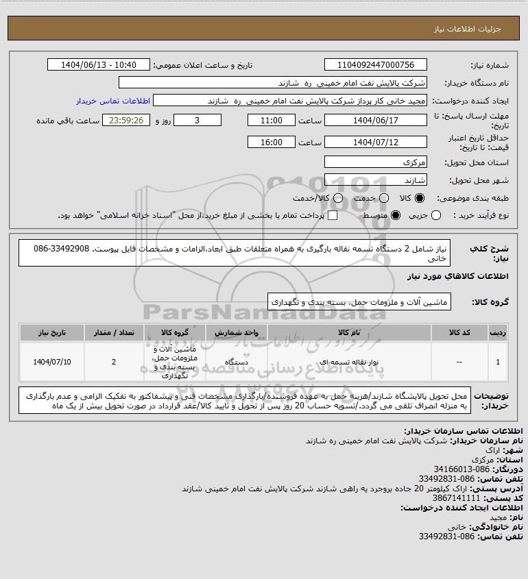 استعلام نیاز شامل 2 دستگاه تسمه نقاله بارگیری به همراه متعلقات طبق ابعادالزامات و مشخصات فایل پیوست. 33492908-086 خانی, استعلام نیاز شامل 2 دستگاه تسمه نقاله بارگیری به همراه متعلقات طبق ابعاد،الزامات و مشخصات فایل پیوست. 33492908-086 خانی