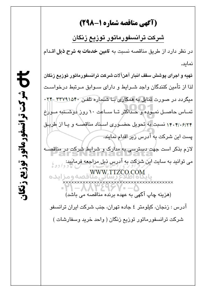 تهیه و اجرای پوشش سقف انبار آهن آلات شرکت ترانسفورماتور توزیع زنگان لذا از تامین کنندگان واجد شرایط و دارای سوابق مرتبط درخواست می گردد در صورت تمایل به همکاری با شماره تلفن 33791540 - 024 تماس حاصل نموده و حداکثر تا ساعت 10 روز دوشنبه مورخ 1404.06.24 نسبت به تحویل حضوری اسناد مناقصه و یا از طریق پست این شرکت به ادرس زیر اقدام نمایند.