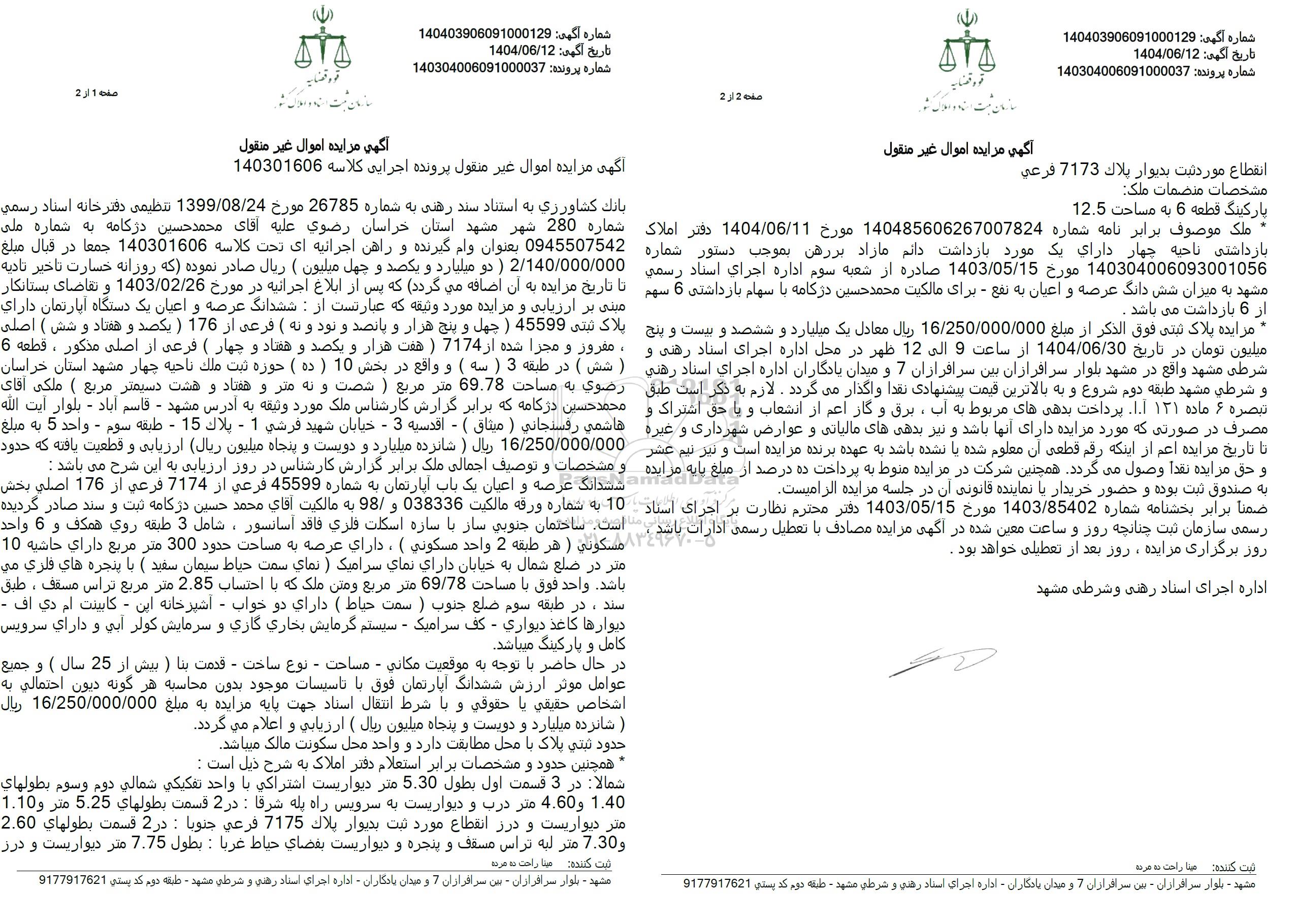 مزایده فروش یک دستگاه آپارتمان دارای پلاک ثبتی 45599 فرعی از 176 اصلی, مزایده فروش یک دستگاه آپارتمان دارای پلاک ثبتی 45599 فرعی از 176 اصلی