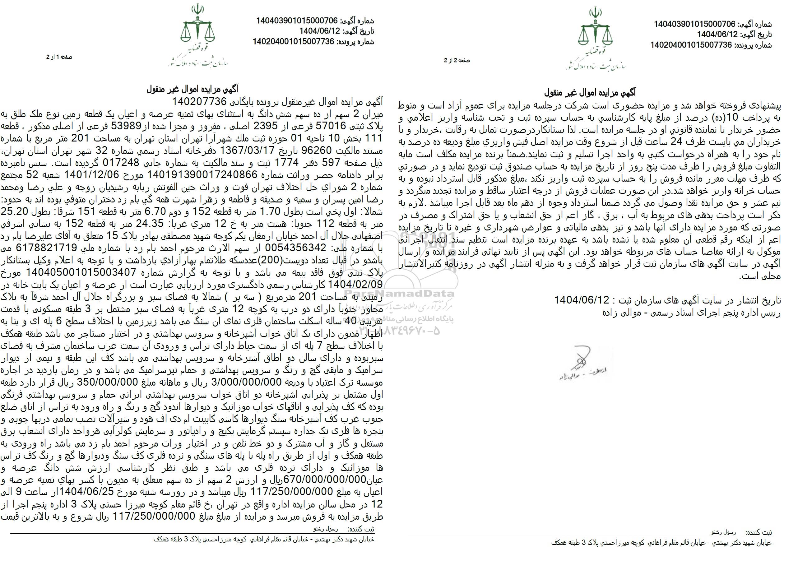 مزایده فروش یک قطعه زمین بهپلاک ثبتی 57016 فرعی از 2395 اصلی به مساحت 201 مترمربع