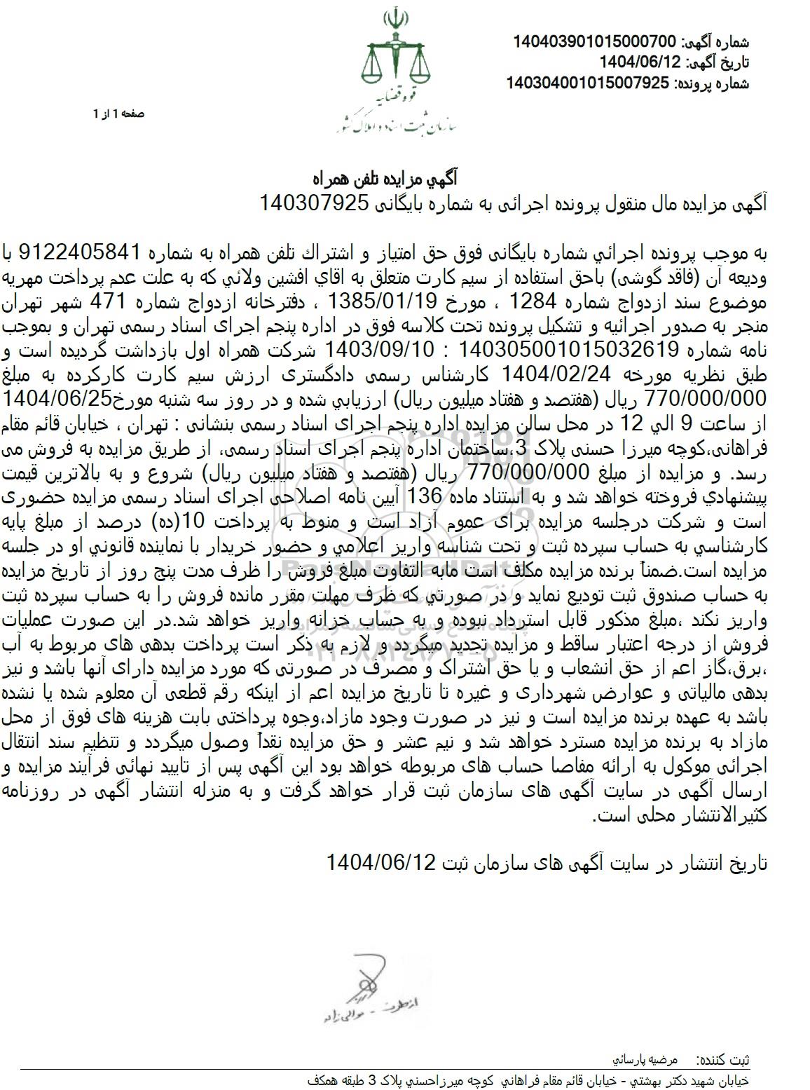 موضوع مزایده : حق امتیاز و اشتراک تلفن همراه به شماره 09122405841 به ارزش 770.000.000 ریال