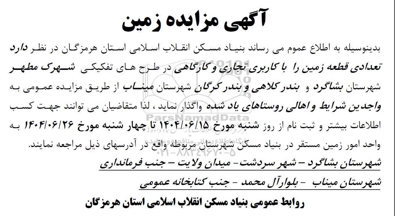 بدینوسیله به اطلاع عموم میرساند بنیاد مسکن انقلاب اسلامی استان هرمزگان در نظر دارد تعدادی قطعه زمین را با کاربری تجاری و کارگاهی در طرح های تفکیکی شهرک مطهر شهرستان بشاگرد و بندر کلاهی و بندر کرگان شهرستان میناب از طریق مزایده عمومی به واجدین شرایط و اهالی روستاهای یاد شده واگذار نماید ، لذا متقاضیان میتوانند جهت کسب اطلاعات بیشتر و ثبت نام از روز شنبه مورخ 1404.06.15 تا چهار شنبه مورخ 1404.06.26 به واحد امور زمین مستقر در بنیاد مسکن شهرستان مربوطه واقع در آدرس های ذیل مراجعه نمایند.