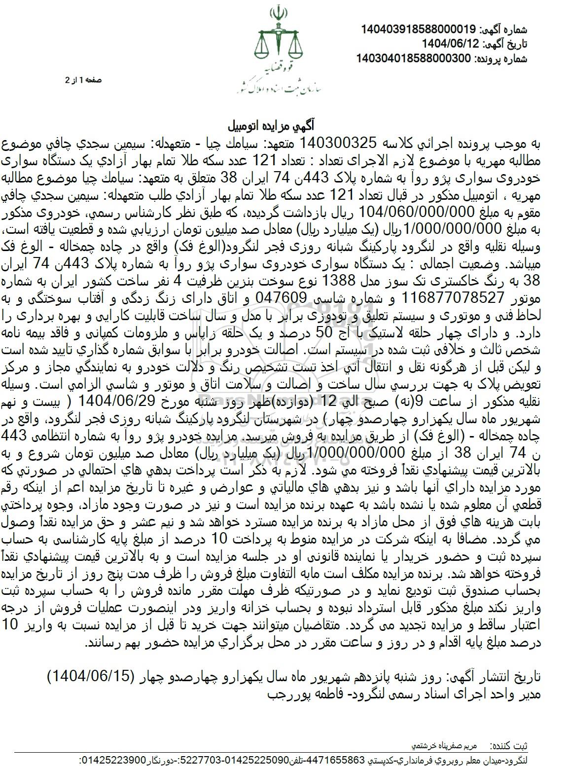 مزایده یک دستگاه سواری پژو روآ  کلاسه 140300325