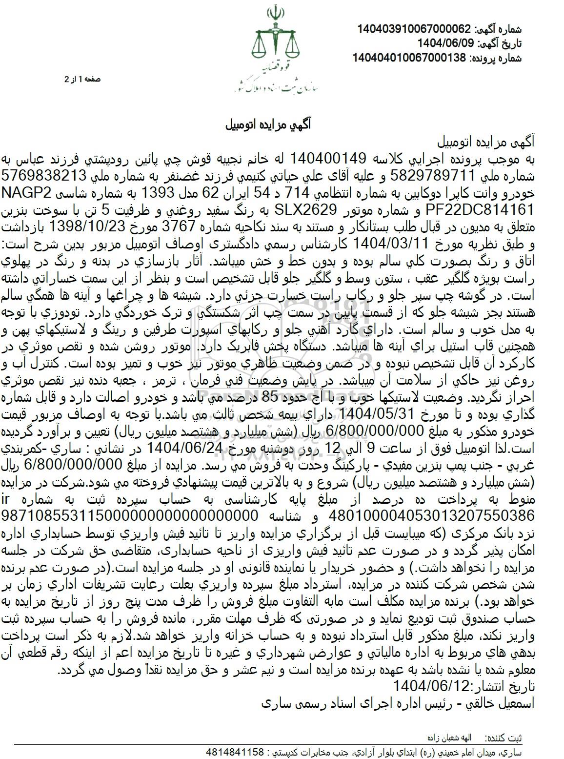 مزایده فروش خودرو وانت کاپرا دوکابین مدل 1393 به رنگ سفید روغنی