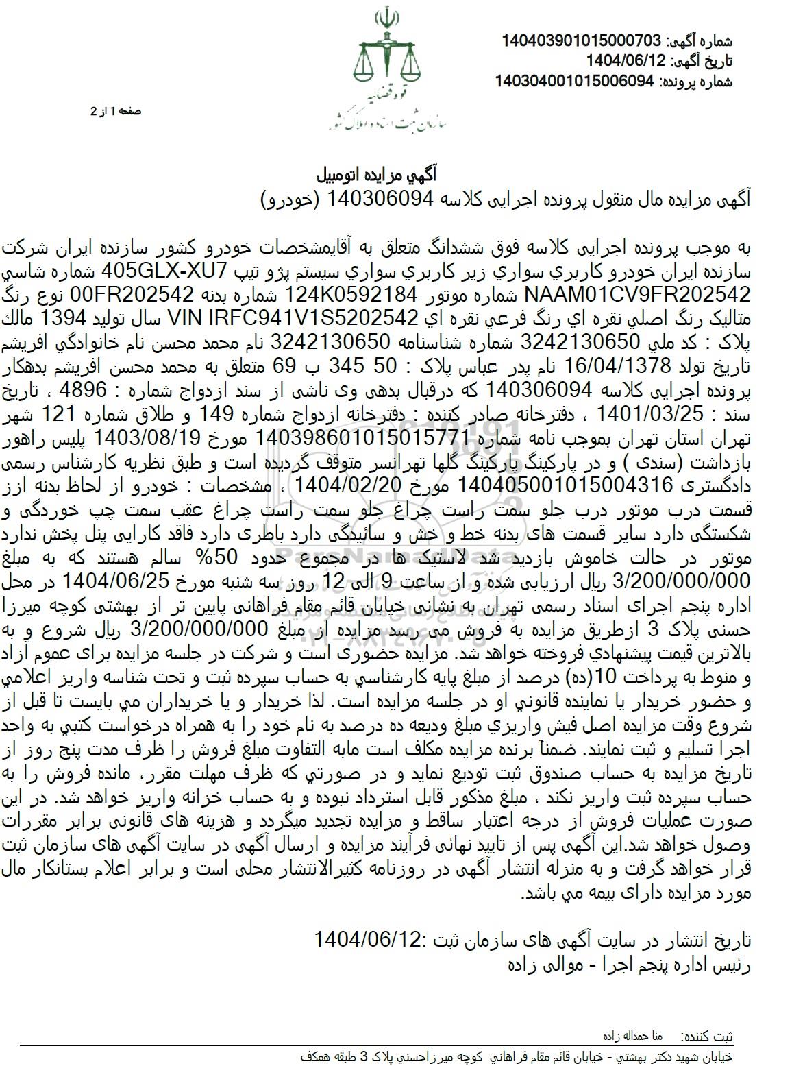 مزایده یک دستگاه سواری پژو متالیک رنگ نقره ای کلاسه 140306094