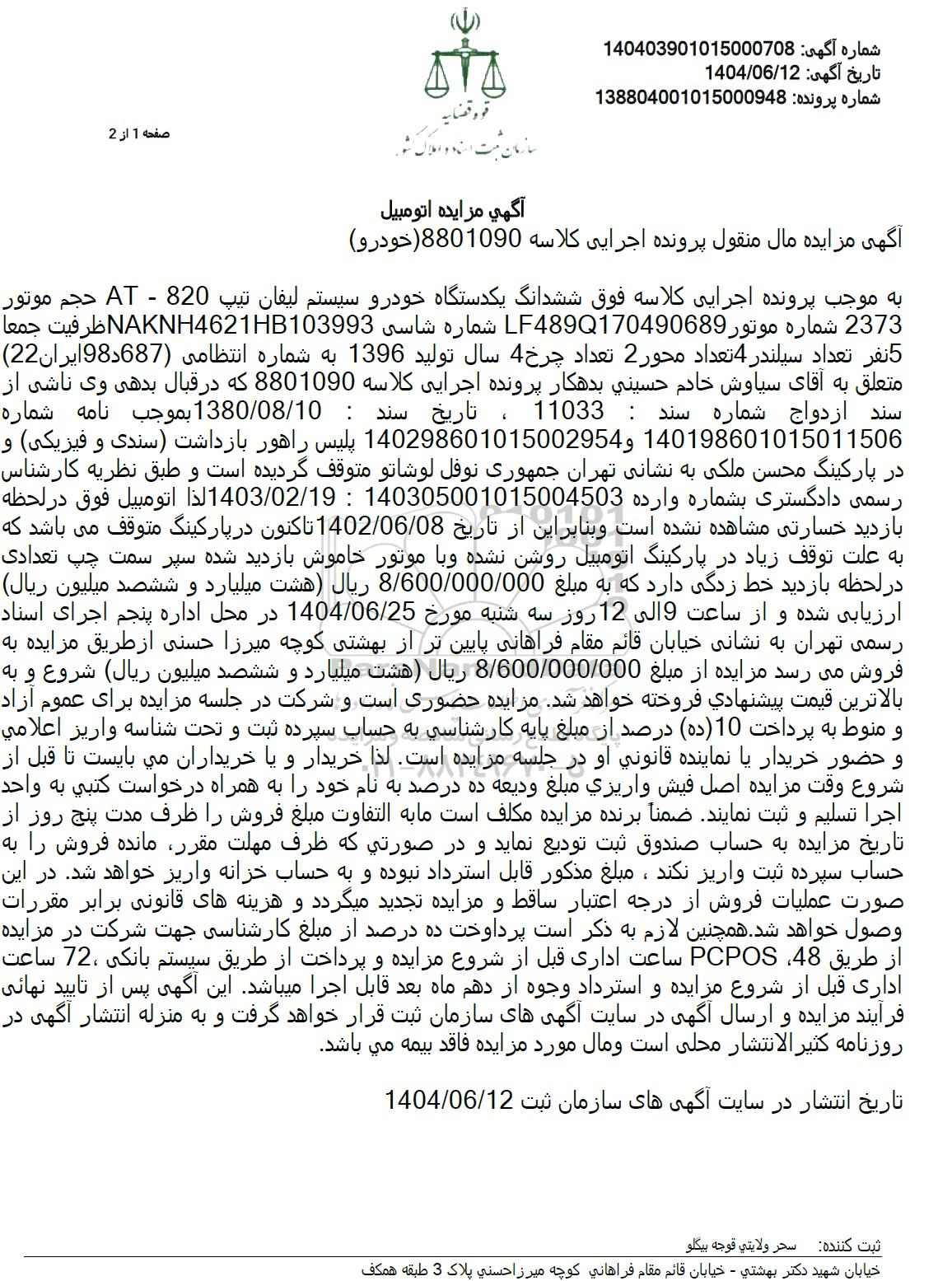 مزایده یک دستگاه خودروی سیستم لیفان  کلاسه 8801090