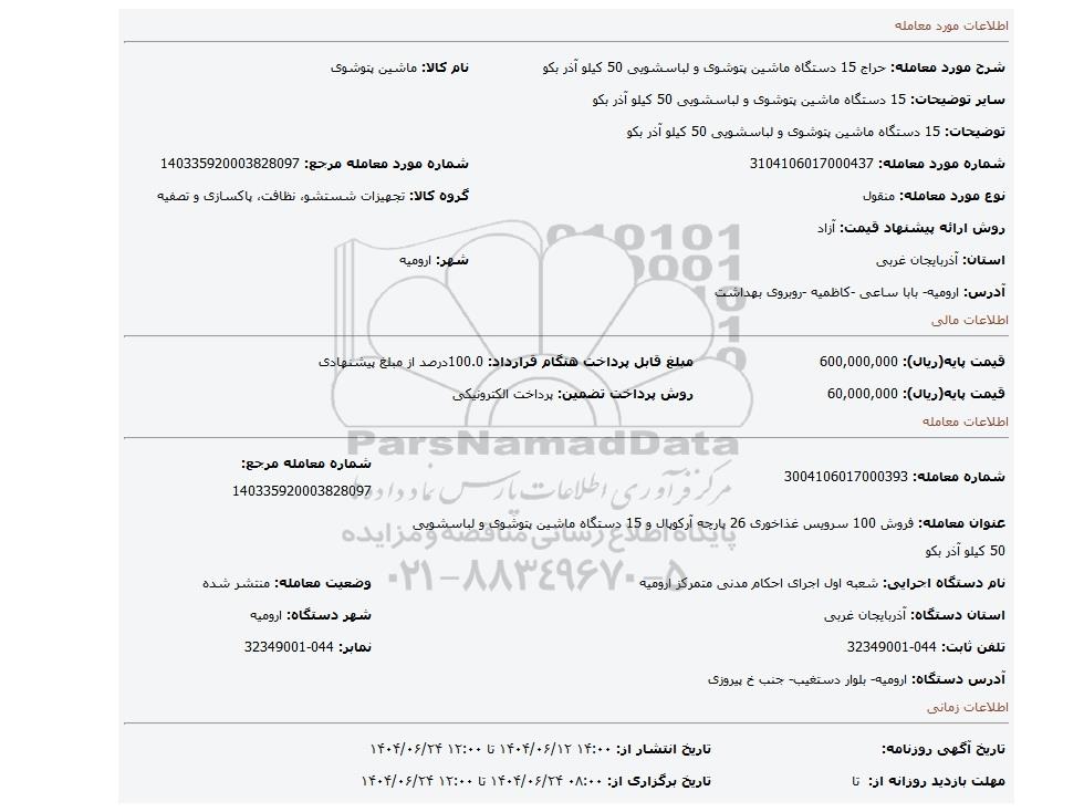 عنوان معامله: فروش 100 سرویس غذاخوری 26 پارچه آرکوپال و 15 دستگاه ماشین پتوشوی و لباسشویی 50 کیلو آذر بکو