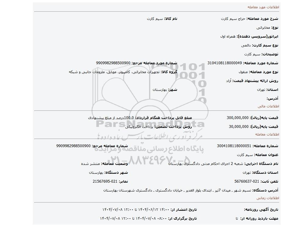 شرح مورد معامله: حراج سیم کارتنام کالا: سیم کارت