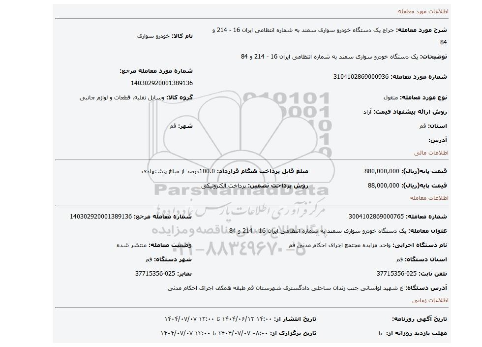 | عنوان معامله: یک دستگاه خودرو سواری سمند به شماره انتظامی ایران 16 - 214 و 84 | ||