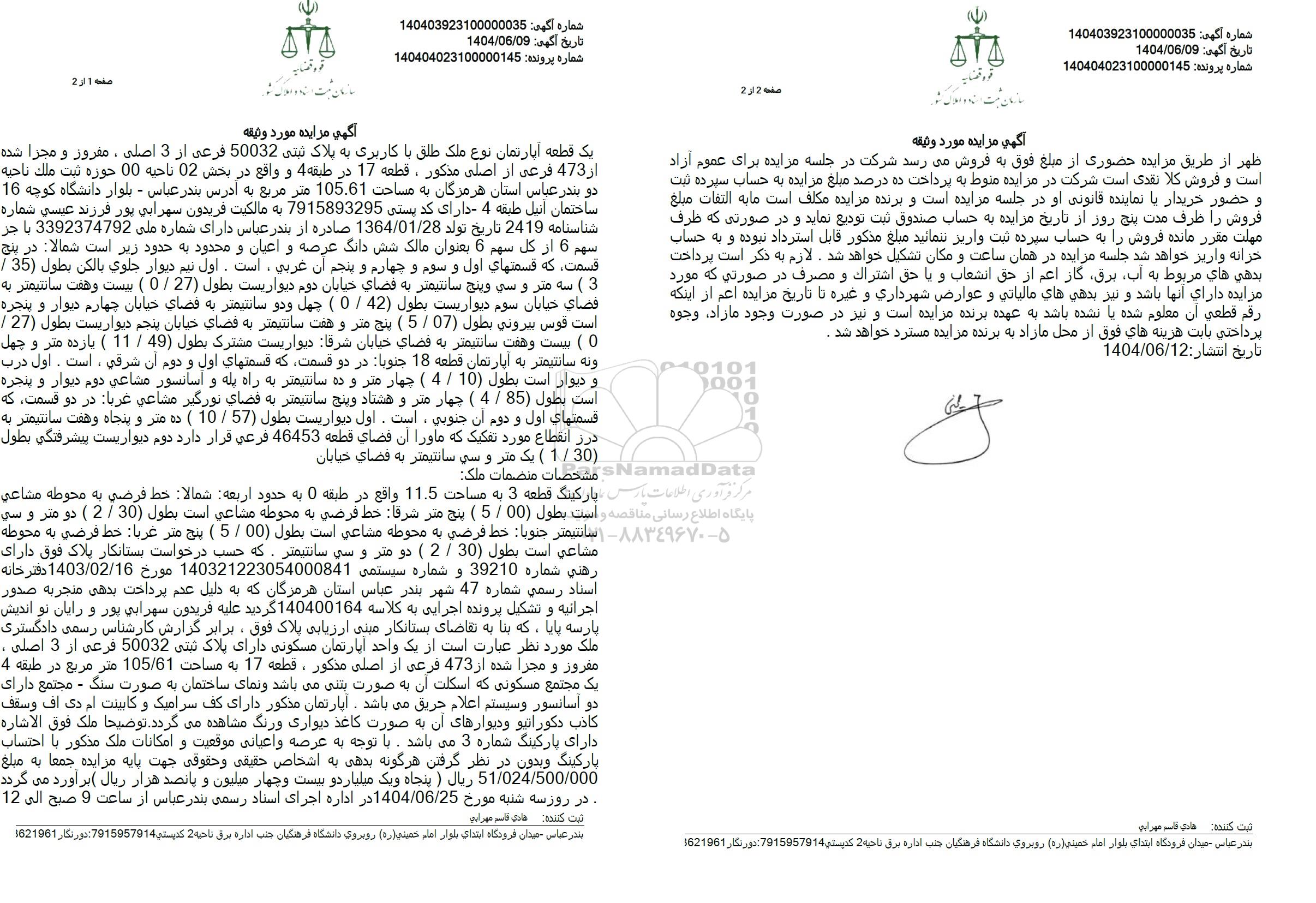 مزایده فروش یک قطعه آپارتمان به پلاک ثبتی 50032 فرعی از 3 اصلی به مبلغ 51.024.500.000 ریال