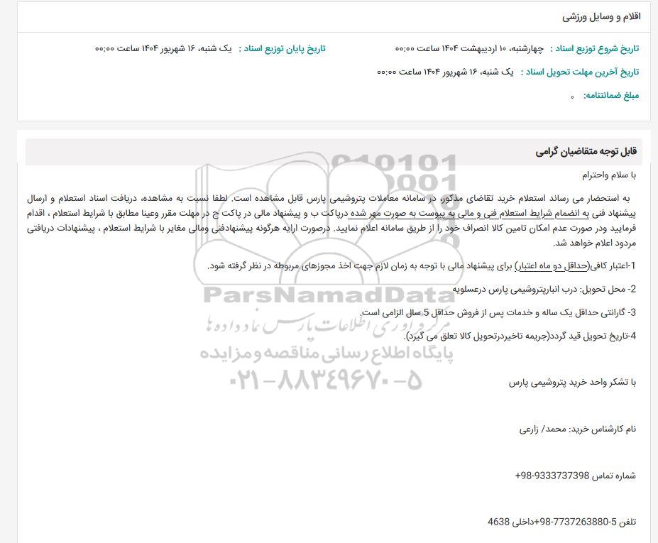 به استحضار میرساند استعلام خرید تقاضای مذکور در سامانه معاملات پتروشیمی پارس قابل مشاهده است. لطفا نسبت به مشاهده دریافت اسناد استعلام و ارسال پیشنهاد فنی به انضمام شرایط استعلام فنی و مالی به پیوست به صورت مهر شده در پاکت ب و پیشنهاد مالی در پاکت ج در مهلت مقرر وعينا مطابق با شرایط استعلام ، اقدام فرمایید و در صورت عدم امکان تامین کالا انصراف خود را از طریق سامانه اعلام نمایید. در صورت ارایه هرگونه پیشنها دفنی و مالی مغایر با شرایط استعلام، پیشنهادات دریافتی مردود اعلام خواهد شد.