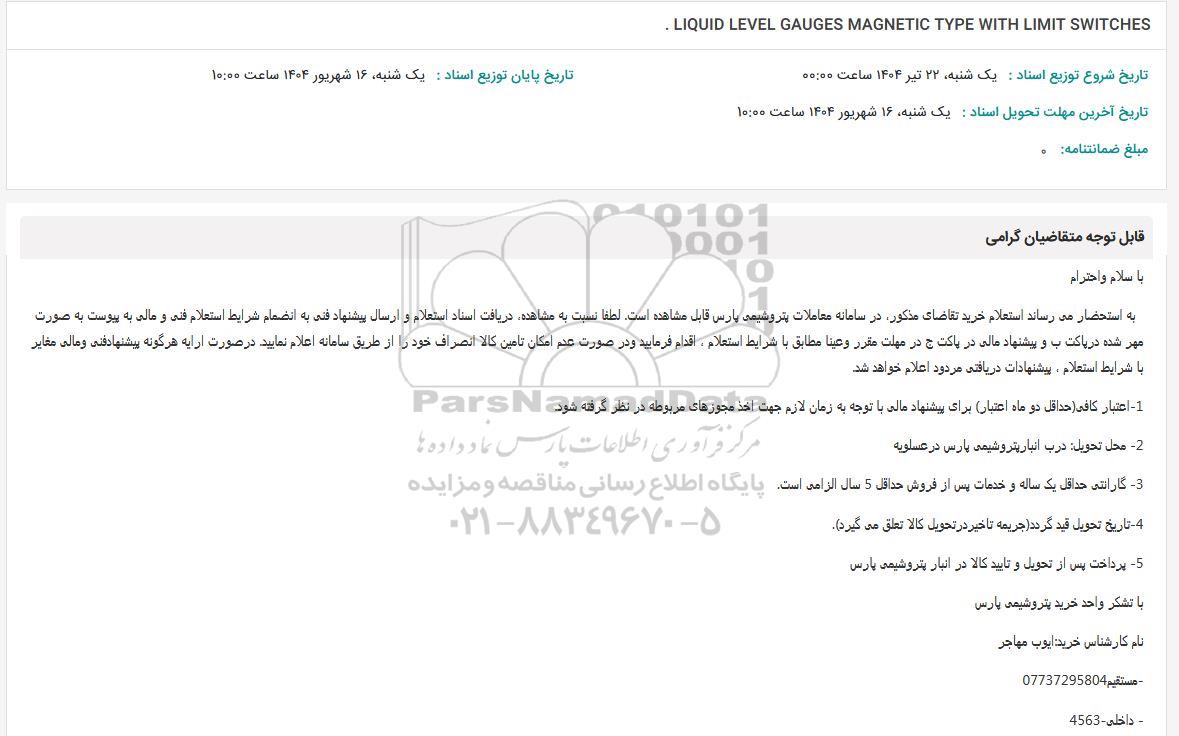 استعلام بها و موضوع استعلام استعلام LIQUID LEVEL GAUGES MAGNETIC TYPE WITH LIMIT SWITCHES به اطلاع کلیه شرکتها و افراد متخصص واجد شرایط میرساند، آگهی گذار در نظر دارد از طریق استعلام بها، نسبت به انتخاب و دریافت پیشنهادات اقدام نماید. این استعلام با کد آگهی ثبت شده در سامانه خبرگزاری پارس نماد : 9500598 منتشر شده است. مشخصات استعلام : تاریخ شروع استعلام: 1404/06/13 آخرین مهلت ارسال پیشنهاد قیمت : 1404/06/16 و محل اجرای پروژه : استان بوشهر میباشد. استعلام قیمت مورد درخواست : استعلام LIQUID LEVEL GAUGES MAGNETIC TYPE WITH LIMIT SWITCHES با دستهبندیهای تخصصی و گروه های مرتبط : ابزار دقیق, انواع کلید و پریزهای برقی و صنعتی, تجهیزات نفت و گاز, تجهیزات برق و الکترونیک, استعلام اطلاع رسانی میگردد. شرایط شرکت در استعلام آنلاین : ابتدا ثبت نام در سامانه استعلام پارس نماد و تکمیل مدارک موردنیاز و بارگذاری در سامانه رعایت تمامی ضوابط و الزامات مندرج در اسناد استعلام است.