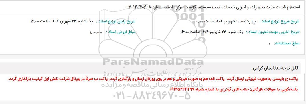 استعلام قیمت خرید تجهیزات و اجرای خدمات نصب سیستم اگزاست مرکز داده به شماره 14040608 - 03