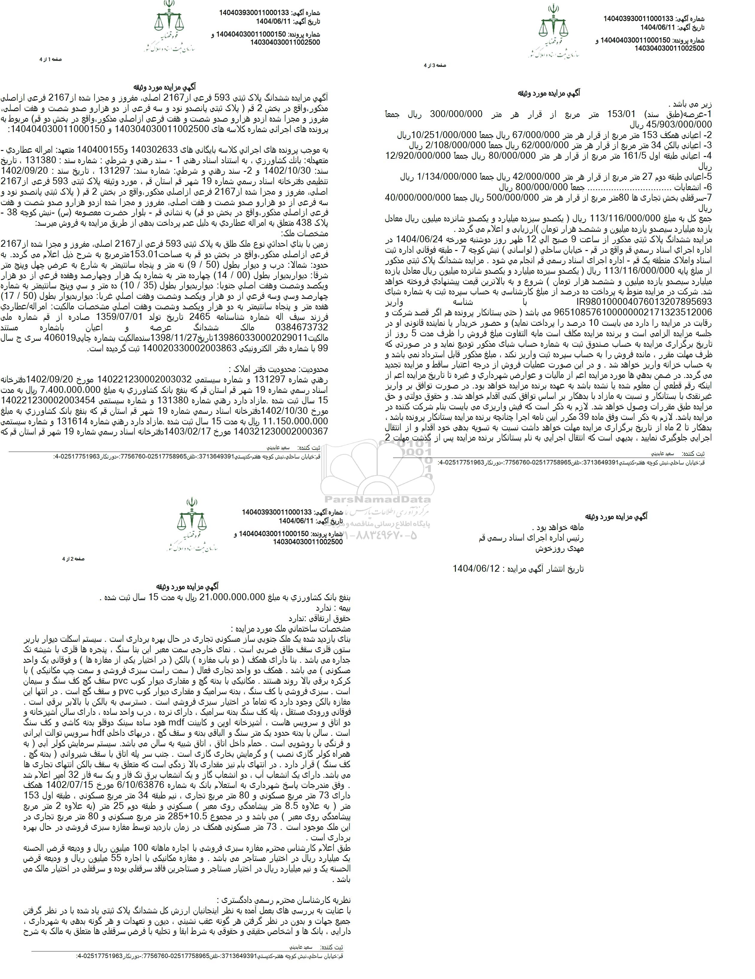مزایده فروش زمین با بنای احداثی نوع ملک طلق به پلاک ثبتی 593 فرعی از 2167 اصلی، مفروز و مجزا شده از 2167 فرعی از اصلی مذکور واقع دربخ شدو قم به مساحت 153.01 متر مربع
