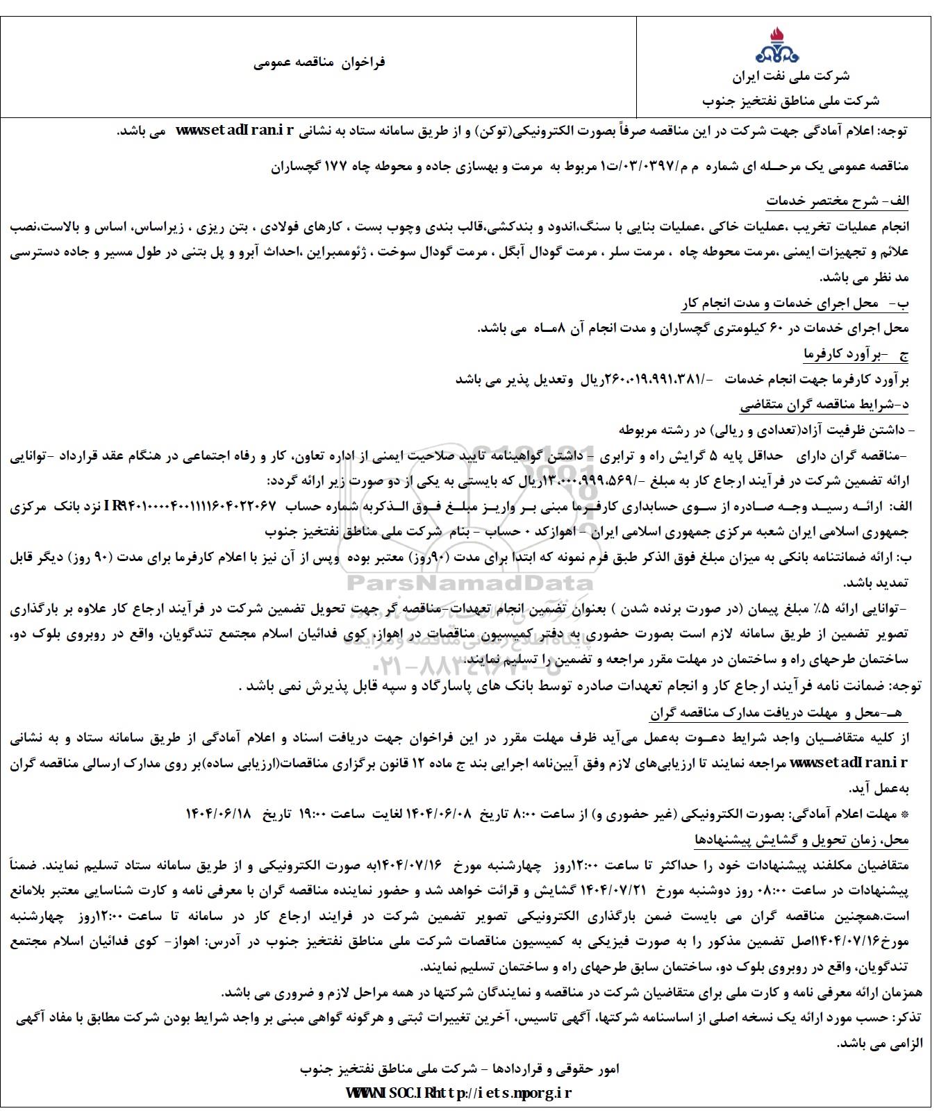 مناقصه عمومی یک مرحله ای شماره م م . 03.0397. ت 1 مربوط به مرمت و بهسازی جاده و محوطه چاه 177 گچساران