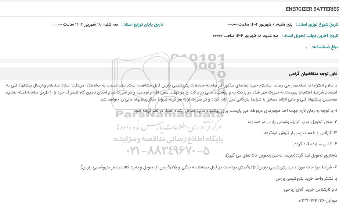 استعلام بها و موضوع استعلام استعلام ENERGIZER BATTERIES به اطلاع کلیه شرکتها و افراد متخصص واجد شرایط میرساند، آگهی گذار در نظر دارد از طریق استعلام بها، نسبت به انتخاب و دریافت پیشنهادات اقدام نماید. این استعلام با کد آگهی ثبت شده در سامانه خبرگزاری پارس نماد : 9500607 منتشر شده است. مشخصات استعلام : تاریخ شروع استعلام: 1404/06/13 آخرین مهلت ارسال پیشنهاد قیمت : 1404/06/18 و محل اجرای پروژه : استان بوشهر میباشد. استعلام قیمت مورد درخواست : استعلام ENERGIZER BATTERIES با دستهبندیهای تخصصی و گروه های مرتبط : منابع تغذیه, تجهیزات برق و الکترونیک, استعلام اطلاع رسانی میگردد. شرایط شرکت در استعلام آنلاین : ابتدا ثبت نام در سامانه استعلام پارس نماد و تکمیل مدارک موردنیاز و بارگذاری در سامانه رعایت تمامی ضوابط و الزامات مندرج در اسناد استعلام است.