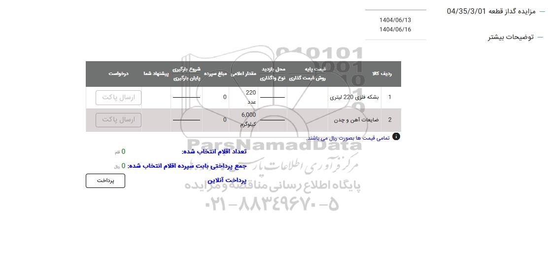 | 2 | ضایعات آهن و چدن | --- | 6.000 کیلوگرم | 10 |