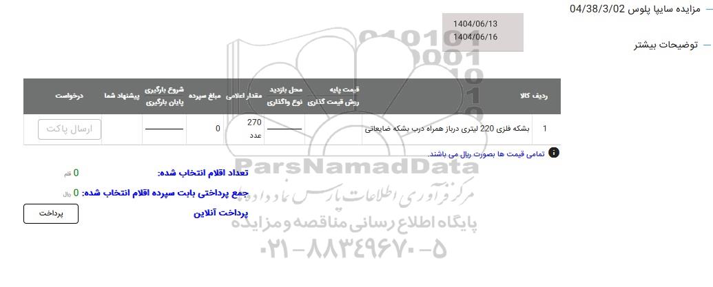 مزایده عمومی مزایده بشکه فلزی 220 لیتری درذباز همراه درب بشکه ضایعاتی برگزار میگردد. از کلیه افراد متخصص و شرکت‌های واجد شرایط دعوت به عمل می‌آید تا در این مزایده با کد خبرگزاری پارس نماد : 9500614 شرکت نمایند تاریخ شروع مزایده : 1404/06/13 مهلت شرکت در مزایده: تا پایان روز 1404/06/16 مکان برگزاری اموال واگذاری استان‌های سایر و دسته‌بندی‌های مربوط به این حراجی آهن آلات, بشکه میباشد. اطلاعات دقیق‌تر درباره شرایط شرکت در مزایده آنلاین و نحوه ارسال مدارک، الزامات پروژه و دریافت اسناد مزایده و تاریخ بازگشایی پاکت‌ها، در بخش اطلاعات تکمیلی این آگهی درج شده است.