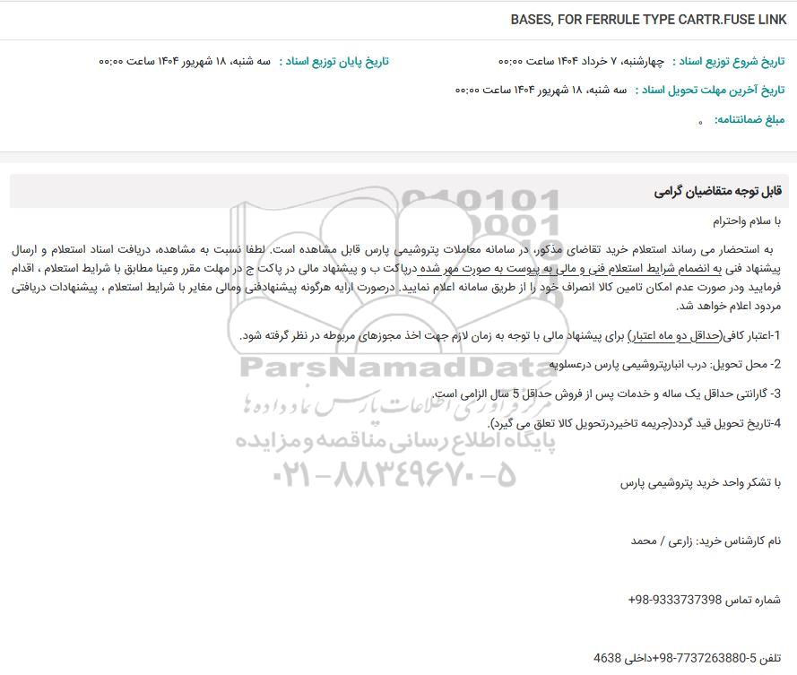به استحضار می رساند استعلام خرید تقاضای مذکور در سامانه معاملات پتروشیمی پارس قابل مشاهده است. لطفا نسبت به مشاهده دریافت اسناد استعلام و ارسال پیشنهاد فنی به انضمام شرایط استعلام فنی و مالی به پیوست به صورت مهر شده در پاکت ب و پیشنهاد مالی در پاکت ج در مهلت مقرر و عينا مطابق با شرایط استعلام ، اقدام فرمایید و در صورت عدم امکان تامین کالا انصراف خود را از طریق سامانه اعلام نمایید. در صورت ارایه هرگونه پیشنهاد فنی و مالی مغایر با شرایط استعلام ، پیشنهادات دریافتی مردود اعلام خواهد شد.
